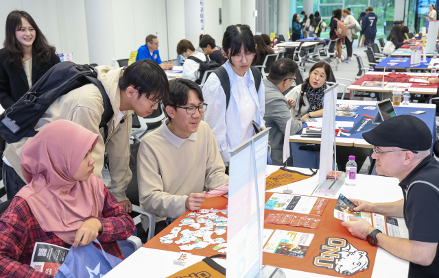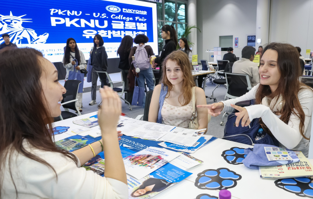14일 부산 남구 국립부경대학교 부경컨벤션홀에서 열린 PKNU 글로벌 유학박람회에 국제학교 학생 등이 미국 대학 진학 상담을 하고 있다.
