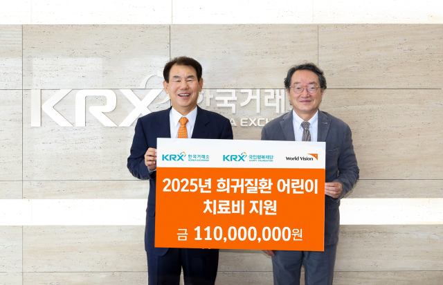 한국거래소(이사장 정은보)는 지난 15일 부산 저소득층 희귀질환 아동 치료비 지원을 위해 후원금 1억 1000만 원을 월드비전(회장 조명환)에 전달했다.