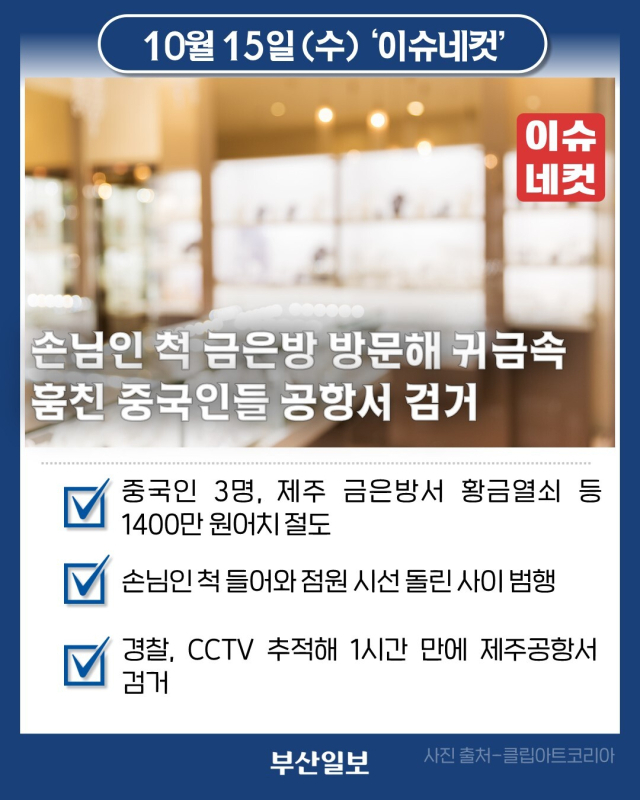 제주의 한 금은방에 들어가 귀금속을 훔쳐 달아난 중국인 일당이 경찰에 붙잡혔습니다. 15일 제주서부경찰서는 특수절도 혐의로 40대 A 씨 등 중국인 3명을 검거해 조사하고 있다고 밝혔습니다. 이들은 이날 낮 12시 50분께 제주시 노형동의 한 금은방에 손님 행세를 하며 들어가 점원이 시선을 돌린 사이 황금열쇠 등 귀금속 1400여만 원 상당을 훔친 혐의를 받습니다. 경찰은 인근 CCTV 등을 분석해 1시간 여 만에 제주공항에서 A 씨 등 3명을 모두 검거했습니다. 경찰은 이들을 상대로 자세한 사건 경위를 조사하고 있습니다.
