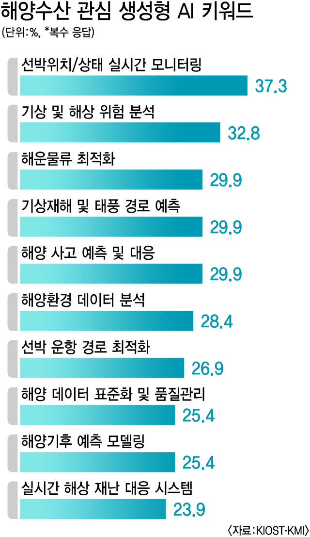 한국해양과학기술원(KIOST)과 한국해양수산개발원(KMI)이 함께 해양수산 관련 기업들을 대상으로 생성형 AI 기술 수요조사를 실시한 결과 AI에 대한 인식도가 낮고 관련 기술을 개발할 인적·물적 기반도 약한 것으로 나타나 공공 부문의 적극적 지원이 필요한 것으로 나타났다.