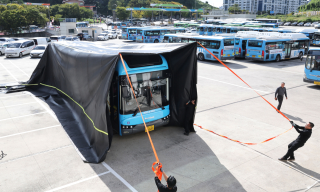 15일 부산 연제구 버스공영차고지에서 열린 전기버스 화재 초동조치 시스템 시연회에서 대형 질식소화포를 활용한 화재진압 과정이 진행되고 있다. 이번 시연회는 전기버스 화재 발생 시 소방대원 도착 전 골든타임 확보를 위한 자구적 대응 역량을 높이기 위해 마련됐다.