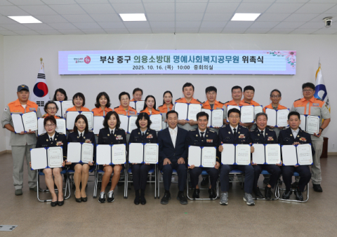 부산 중구(구청장 최진봉)는 16일 중부소방서 의용소방대원 54명을 중구 명예사회복지공무원으로 위촉하는 행사를 개최했다고 밝혔다.