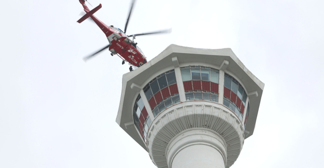 화재와 붕괴 발생에 따른 현장 재난대응 체계를 확립하고 대응 역량을 강화하기 위한 ‘2025년 재난대응 안전한국훈련’이 16일 오후 부산 중구 용두산공원에서 열렸다. 소방헬기가 공원 내 부산타워에서 인명을 구조하고 있다.