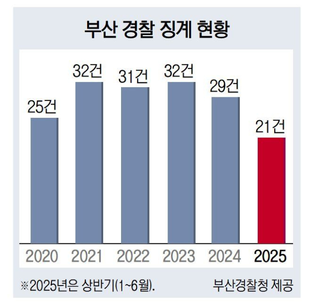 지난해 1년간 징계는 29건이었는데 올해는 상반기에만 21건을 기록했다. 최근 5년간 징계 현황을 봐도 특히 올해 징계 건수가 많다. 부산에서는 2020년 25건, 2021년 32건, 2022년 31건, 2023년 32건, 지난해 29건의 징계가 있었다. 이대로라면 부산 경찰 징계는 올해 가장 많을 것으로 예상된다.