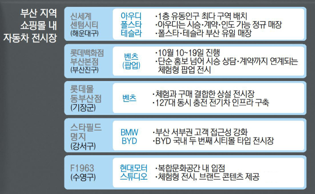 신세계 센텀시티몰과 롯데백화점 부산본점, 롯데몰 동부산점 등은 자동차관을 단순 임대가 아닌 체류형 콘텐츠로 키워가고 있다.