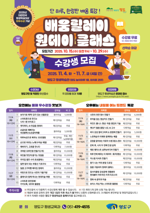 부산 영도구(구청장 김기재)는 ‘대한민국 평생학습대상 최우수상’ 수상을 기념하여 오는 11월 4~7일까지 4일간 영도구 평생학습관에서 ‘2025 영도구 배움릴레이 원데이 클래스’를 운영하며, 현재 수강생을 모집 중이라고 밝혔다.