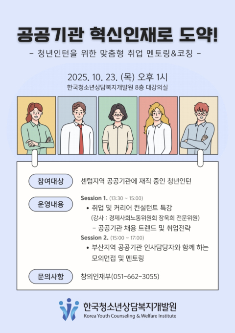 한국청소년상담복지개발원(이사장 한정원, 이하 상담원)은 오는 23일 ‘공공기관 혁신인재로 도약!-청년인턴을 위한 맞춤형 취업 멘토링&코칭’ 프로그램을 처음으로 개최한다고 밝혔다.