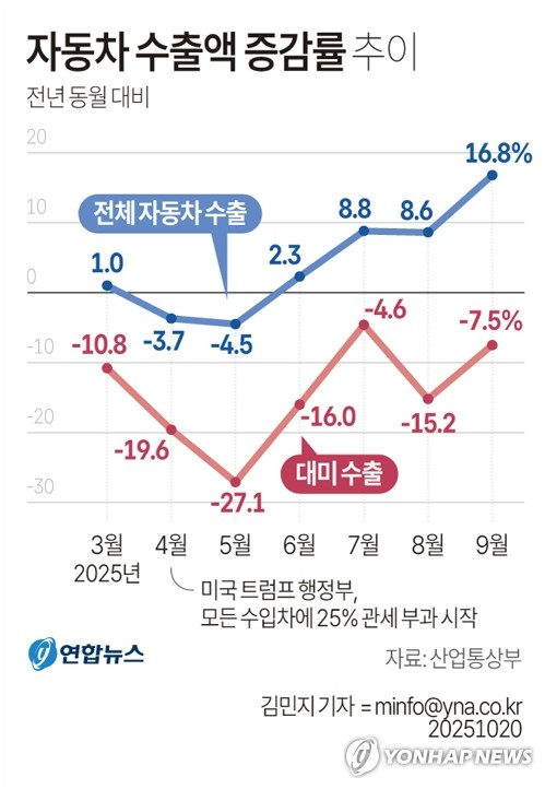 9월 전체 車 수출 8.6%↑…미국은 7.5%↓