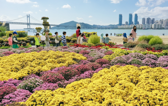 20일 부산 수영구 광안리 민락해변공원 광장에 형형색색의 국화가 전시돼 시민들의 눈길을 사로잡고 있다. 이번 전시에서는 1만 6000본의 국화로 꽃과 나비 모양을 형상화한 꽃밭을 조성해 볼거리를 선사한다.