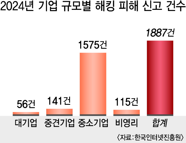 실제 피해 신고도 폭발적으로 증가하고 있다. 한국인터넷진흥원에 접수된 기관·기업 해킹 피해 신고 건수는 2021년 640건에서 2022년 1142건, 2023년 1277건, 2024년 1887건으로 급증하고 있다. 올해도 8월까지 1501건을 기록, 최고치를 갈아치울 것으로 전망된다. 2024년 기준 중소기업에만 해킹 신고가 1575건이 몰리며 중소기업이 주요 타깃이 되는 모양새다.