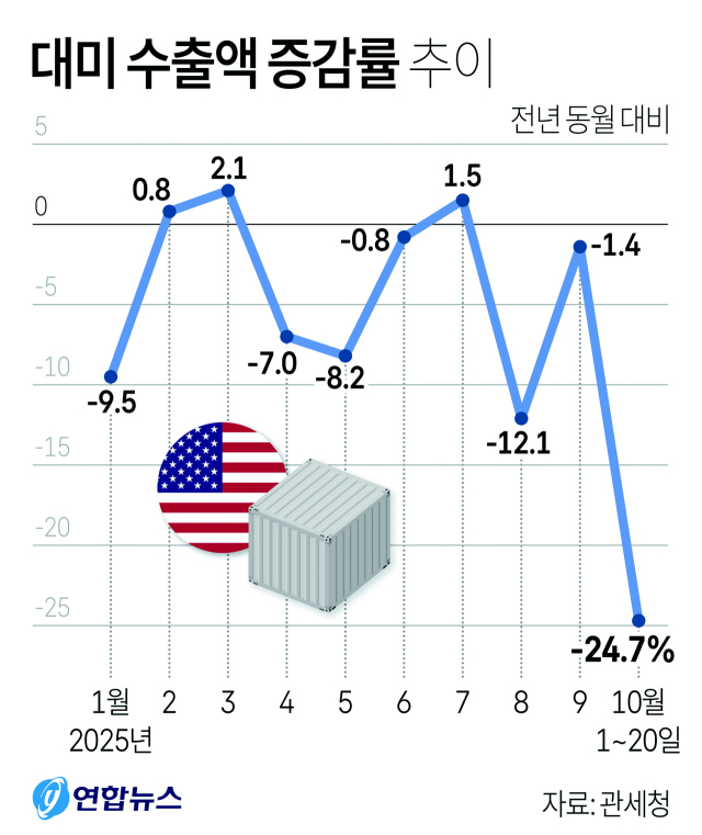 추석 연휴로 10월 1~20일 수출 7.8% 감소…대미 수출 24.7% 급감