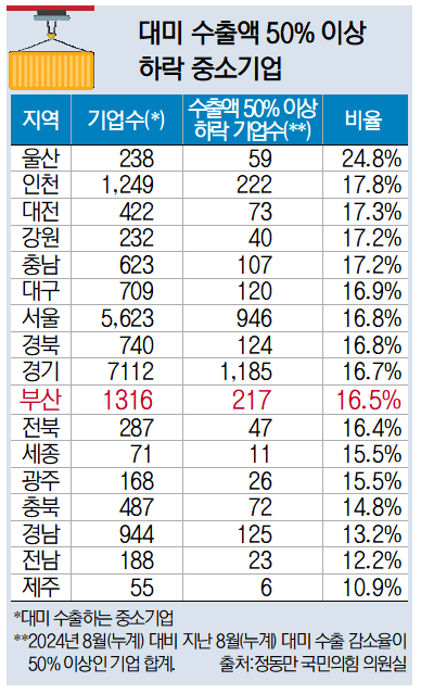 국회 산업통상자원중소벤처기업위원회 정동만 국민의힘 의원이 중소벤처기업부(이하 중기부)에서 제출받은 자료에 따르면, 지난해 8월(누계) 대비 지난 8월(누계) 대미 수출 감소율이 50% 이상인 부산 중소기업은 217곳으로 나타났다. 이는 미국으로 수출하는 부산 기업 전체의 약 16.5%에 이른다.