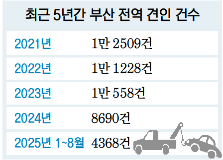 불법 주정차 견인 건수가 매년 감소하면서 부산 지자체와 위탁 계약을 맺은 견인업체가 경영난에 시달린다. 지자체들이 민원을 이유로 견인 자체를 줄인 것이 주요 원인으로 꼽힌다. 줄폐업이 지속되면 견인 대란이 일어날 수 있다는 우려도 제기된다.