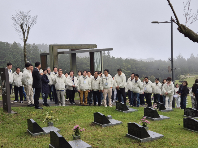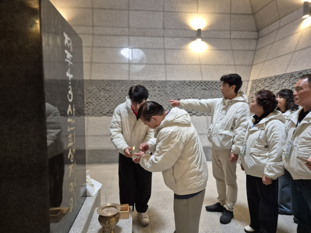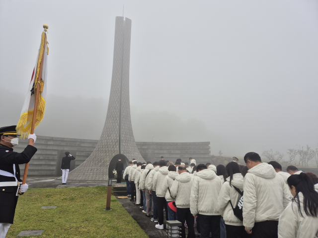 탐방단은 제주도에 도착하자마자 가장 먼저 국립제주호국원을 찾았다. 장대비가 내린 뒤 갠 하늘 아래 묵묵히 서 있는 위패들과 태극기가 바람에 흩날렸다. 참가자들은 호국원 현충탑 앞에서 묵념하며, 신한춘 회장은 ‘국가를 위해 희생하신 호국 영령의 영원한 안식을 기원하며, 그분들의 헌신과 희생을 기억하고 예우하겠습니다’라고 방명록에 적었다.