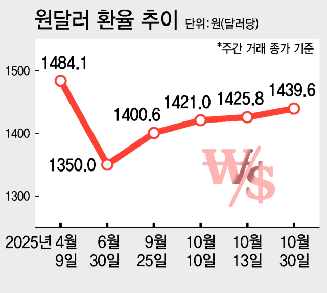 최근 환율 상승 요인으로는 한미 관세협상 불확실성이 꼽힌다. 한미 양측은 다음주 경주에서 열리는 아시아태평양경제협력체(APEC) 정상회의에서 타결을 목표로 관세 협상을 진행 중인데 주요 쟁점인 3500억 달러 대미 투자 패키지 구성에서 아직 합의점을 찾지 못한 것으로 알려졌다.