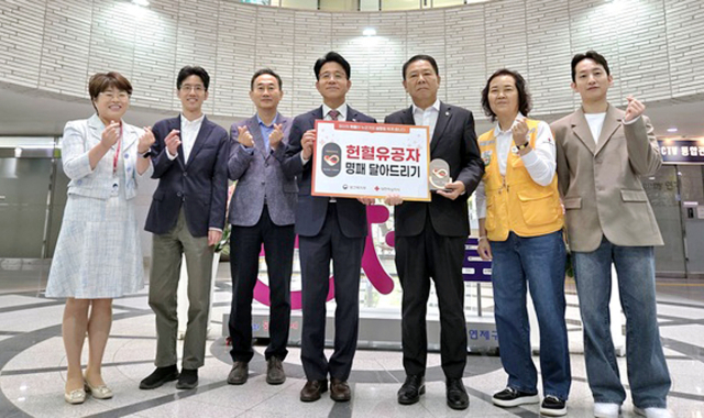 대한적십자사 부산혈액원은 지난 22일 헌혈자가 존경받는 사회적 분위기 조성을 위해 부산 연제구의회 차성민(오른쪽에서 세번째) 의원에게 ‘헌혈유공자의 집’ 명패를 전달했다.
