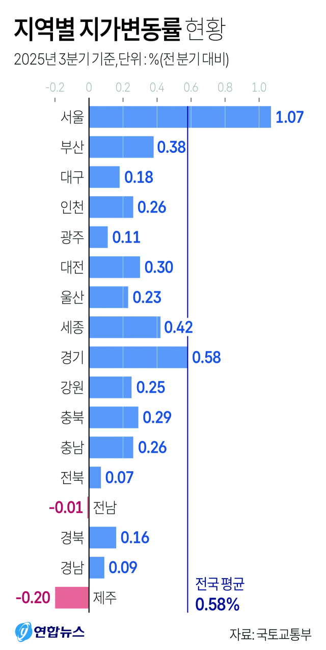 27일 국토교통부가 발표한 ‘지가변동률 및 토지거래량’에 따르면 3분기 전국 땅값은 0.58% 올랐다. 서울이 1.07% 오른 것이 전체 평균을 확 끌어올렸다.