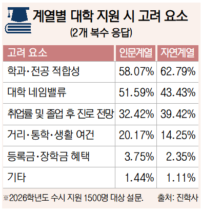 다만 계열별로 살펴보면 구체적인 수치에서 차이를 보였다. 인문계 수험생 역시 전공 적합성을 가장 중요한 기준으로 꼽았지만 비율은 58.1%로 자연계 수험생(62.8%)보다 낮았다. 특히 ‘대학 네임밸류’를 꼽은 인문계는 51.6%로 절반을 넘어, 자연계(43.4%)보다 8%포인트(P) 높았다. 또한 자연계는 39.4%가 ‘취업률과 졸업 후 진로 전망’을 선택했지만 인문계는 32.4%에 그쳤다. 인문계는 대학 브랜드를 사회적 평가와 연결해 생각하는 경향이 강하고, 자연계는 전공의 실용성과 진로 연계 가능성을 더 중시하는 것으로 풀이된다.