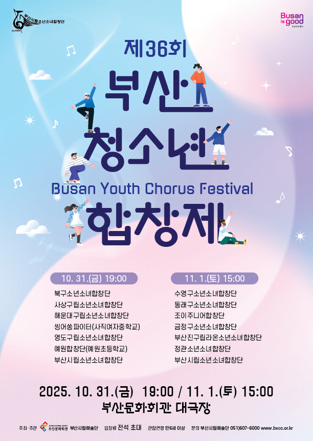 청소년들의 음악 활동을 장려하고, 건전한 청소년 문화를 조성하기 위한 제36회 부산청소년합창제가 오는 31일부터 내달 1일까지 부산문화회관에서 열린다.