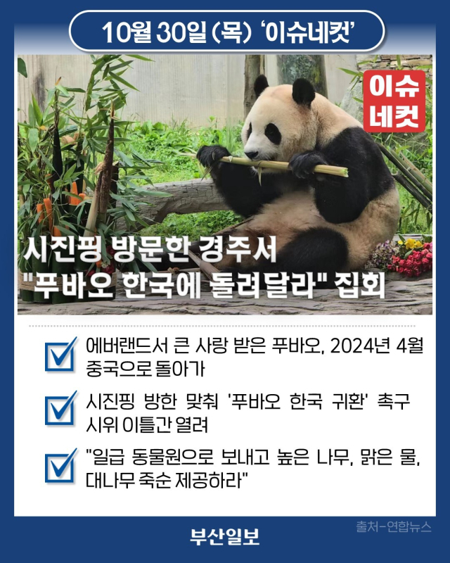시진핑 중국 국가주석이 2025 아시아태평양경제협력체(APEC) 정상회의 참석을 위해 방한한 가운데, "중국에 간 푸바오가 우리나라로 다시 돌아와야 한다"는 주장이 나왔습니다. 30일 동물보호단체 '푸바오와 푸덕이들' 소속 회원 15명은 경북 경주시 황남동 내남사거리에서 "동물보호법이 지켜야 할 멸종동물 판다 '푸바오'가 한국에 돌아올 수 있도록 도와달라"며 집회를 열었습니다. 이들은 "판다 푸바오는 중국 쓰촨의 번식 기지를 떠나 일급 동물원으로 가야 한다"며 "시진핑 중국 국가주석은 판다의 기본 생리에 맞는 높은 나무와 맑은 물, 대나무 죽순을 제공하라"고 요구했습니다. 이날부터 APEC 정상회의가 개막하는 오는 31일까지 이틀간 '인간과 동물이 공존하는 지속 가능한 세상'을 주제로 경주에서 시위가 진행됩니다. 푸바오(福寶)는 2016년 3월 시진핑 중국 국가주석이 한중 친선 도모의 상징으로 보내온 판다 러바오와 아이바오 사이에서 자연 번식으로 태어난 판다입니다. 2024년 4월 3일 중국으로 돌아가기 전까지 용인 에버랜드에서 생활하며 '용인 푸씨', '푸공주', '푸뚠뚠' 등 많은 애칭으로 불리며 큰 사랑을 받았습니다.