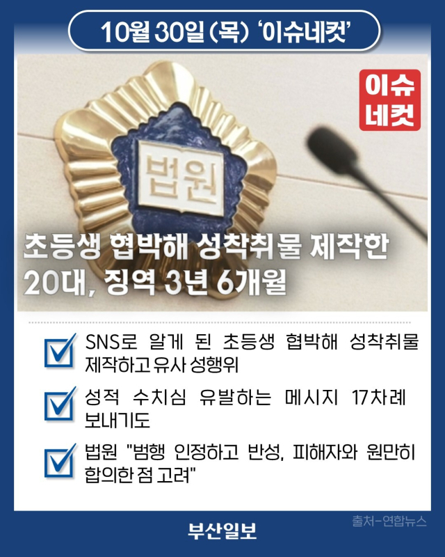 초등학생을 협박해 성착취물을 제작하고, 유사성행위까지 한 20대가 실형을 선고받았습니다. 30일 제주지법 형사2부는 성폭력범죄의 처벌 등에 관한 특례법 위반(13세 미만 미성년자 유사성행위) 등 혐의로 구속기소 된 20대 A 씨에 대해 징역 3년 6개월을 선고했습니다. 성폭력 치료 프로그램 40시간 이수와 7년간 아동·청소년·장애인 관련 기관 취업제한도 명령했습니다. A 씨는 지난해 6월 8일 SNS를 통해 알게 된 13세 미만 아동을 협박해 성착취물을 제작하고 유사성행위를 한 혐의를 받습니다. 피해 아동에게 17차례에 걸쳐 성적 수치심을 유발하는 메시지를 보내기도 했습니다. 재판에서 A 씨는 공소사실을 모두 인정했습니다. 재판부는 "피고인은 초등학생에 불과한 피해자를 범행 대상으로 삼았으며 신상 공유 협박으로 비정상적인 영상을 촬영하게 하는 등 죄책이 무겁다"고 지적했습니다. 다만 "범행을 인정하고 반성하는 점, 피해자와 원만히 합의한 점을 참작했다"고 양형 이유를 밝혔습니다.