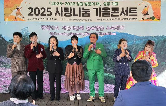 재부산강원도청장년회(회장 안정태)는 지난달 31일 부산 수영구 광안동 수영구장애인복지관 옥상정원에서 지역 저소득 어르신과 장애인들을 초청해 ‘2025~2026 강원 방문의 해’ 성공을 기원하는 '2025 사랑나눔 가을콘서트'를 개최했다.