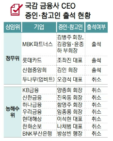 특히 정무위 국감 증인 및 참고인에는 5대 금융지주(KB·신한·하나·우리·NH농협금융)와 은행의 회장과 행장들이 모두 채택되지 않았다. 오히려 농림축산식품해양수산위원회(농해수위)에서 양종희 KB금융 회장, 진옥동 신한금융 회장, 함영주 하나금융 회장, 임종룡 우리금융 회장, 박상진 산업은행 회장, 방성빈 부산은행장 등을 증인으로 불렀다. 하지만 이마저도 소환이 철회되며 모두 출석을 피했다. 금융권 관계자는 “과거 망신주기 식 출석이 잦았던 만큼 긍정적으로 보인다”면서도 “다만 국회 본연의 감시 기능인 국감 취지에 맞는지 의문도 든다”고 지적했다.