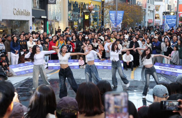 2일 부산 중구 광복로 일대에서 열린 ‘부산 스트릿 페스타 인(in) 광복’ 행사에서 케이팝 플래시몹이 진행되고 있다. 이번 행사는 원도심을 찾는 국내외 관광객에게 다채로운 즐길 거리를 제공하기 위해 음악, 댄스, 코미디, 퍼포먼스 장르의 다양한 공연 프로그램으로 구성됐다.