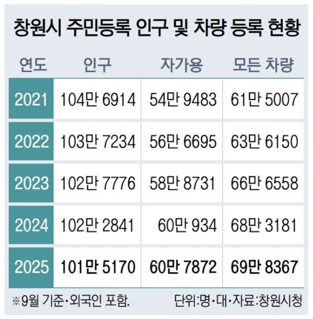 그러나 이 같은 추이는 이미 예고된 결과라는 분석도 나온다. 창원시엔 인구가 갈수록 줄어가고 있는 상황에도 자가용 이용자 수는 꾸준히 늘어나고 있기 때문이다. 창원시 인구(외국인 포함)는 2021년 9월부터 2025년 9월까지 5년 새 104만 6914명에서 101만 5170명으로 쪼그라들었다. 매해 평균 8000여 명이 줄어든 것이다.