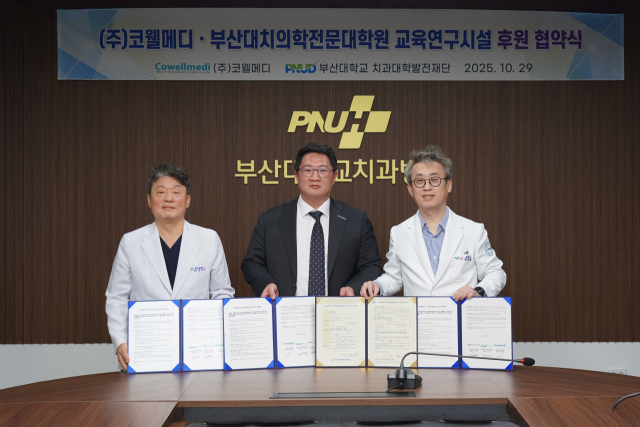 부산대치과병원은 국내 임플란트 전문기업 (주)코웰메디와 치의학 인재 양성 및 교육·연구 환경 조성을 위한 업무협약(사진)을 체결하고 발전기금 5억 원을 유치했다고 3일 밝혔다.