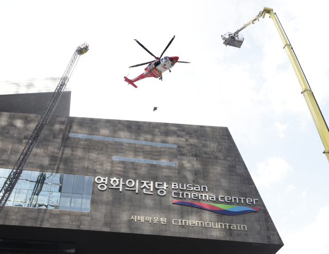 3일 오후 부산 해운대구 영화의전당에서 ‘2025 해운대구 재난대응 안전한국훈련’이 진행되고 있다. 이번 훈련은 지진으로 인한 극장 화재와 인명 사고 발생 상황을 가정해 진행됐다.