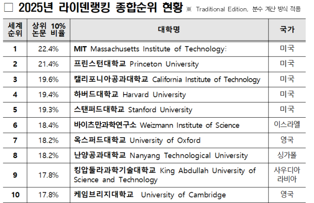 2025년 평가에는 전 세계 77개국 1594개 대학과 국내 52개 대학이 포함됐다. 조사 기간은 2020년부터 2023년까지 발표된 논문이다. 평가 과정에서는 공동 저술에 대한 기여 비율을 조정해 대학별 기여도를 면밀히 따졌다.