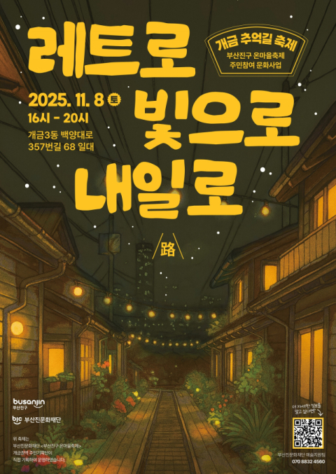 (재)부산진문화재단(이사장 김영욱 부산진구청장)은 부산진구 개금3동 ‘개금 추억길’에서 오는 8일 오후 4시에서 8시까지 골목의 기억과 사람들의 이야기가 어우러지는 ‘부산진구 온마을축제’ 개금 추억길 축제 ‘레트로, 내일로, 빛으로’ 행사를 개최한다고 밝혔다.