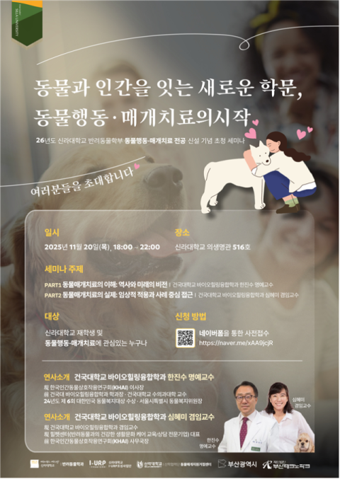 신라대 반려동물학과는 2026학년도 확대 개편되는 반려동물학부의 ‘동물행동·매개치료 전공’ 개설을 기념하여 국내 동물매개치료 분야의 권위자인 건국대학교 한진수 교수와 심혜미 교수를 초청해 ‘동물과 인간을 잇는 새로운 학문, 동물행동·매개치료의 시작’이라는 주제를 담은 세미나를 오는 20일 저녁 6시 신라대 의생명관 516호에서 개최한다.