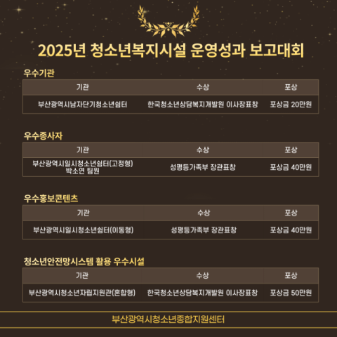 이날 청소년쉼터 종합평가에서 부산광역시일시청소년쉼터(이동형), 부산광역시일시청소년쉼터(고정형)가 최우수 기관에 선정됐으며, 공적 우수기관에 부산광역시남자단기청소년쉼터가 선정돼 한국청소년상담복지개발원 이사장 표창을 수상했다.