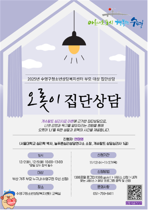 탁희욱 수영구청소년상담복지센터장은 “이번 집단상담은 부모님들이 스스로를 이해하고 치유하는 시간을 통해 자녀와의 관계에서 보다 따뜻하고 건강한 소통을 이어가는 계기가 되길 바란다”고 전했다.