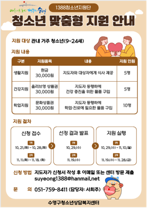 지원 대상은 관내 9~24세 청소년으로 센터를 이용하고 있는 청소년뿐만 아니라 도움이 필요한 일반 청소년도 신청할 수 있다. 신청을 희망하는 경우 수영구청소년상담복지센터로 문의하면 된다.