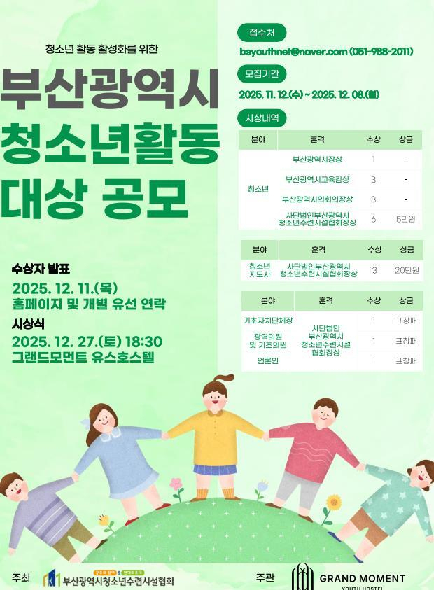 (사)부산시청소년수련시설협회(이사장 박용하)와 그랜드모먼트 유스호스텔(운영대표 박수영)은 14일 부산 지역 청소년활동 활성화에 기여한 개인과 단체를 대상으로 ‘2025년 청소년활동 대상’ 후보자 공모를 시작한다고 밝혔다.