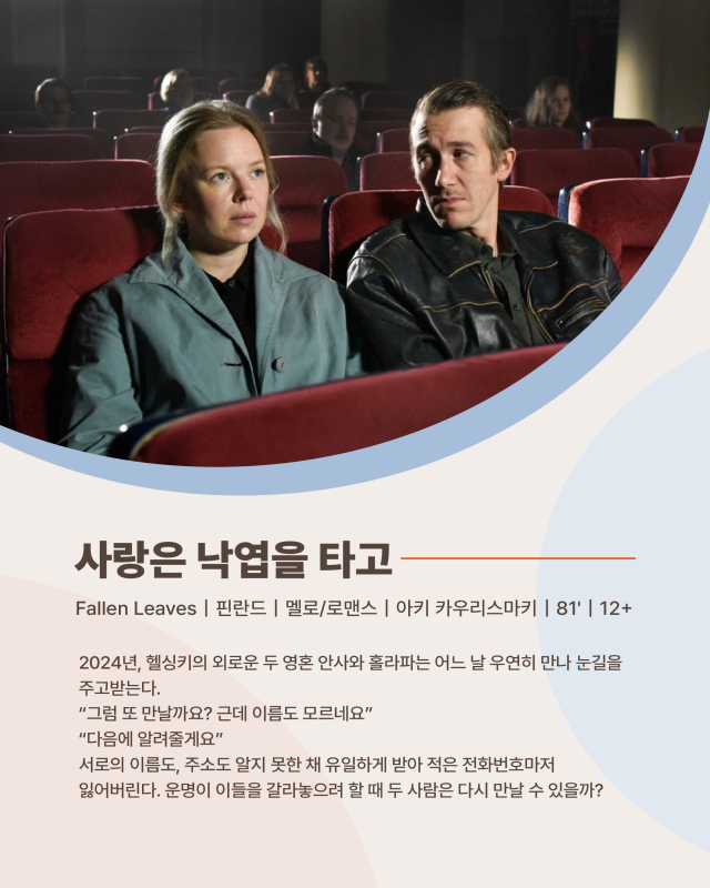 ‘사랑은 낙엽을 타고'는 제76회 칸 영화제 심사위원상 수상작으로, 핀란드 헬싱키에 사는 두 외로운 남녀가 우연히 만나며 벌어지는 이야기를 다룬 로맨틱 코미디물이다.