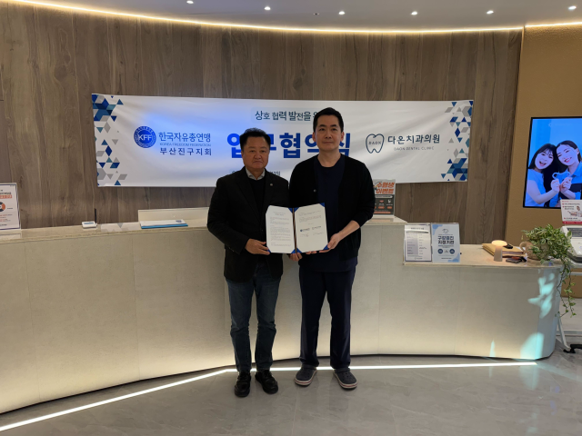 한국자유총연맹 부산진구지회(회장 노학양)는 13일 부산진구 초읍 다온치과의원(대표원장 이철민)과 지역사회 공헌과 보건의료 서비스 향상을 위한 업무협약을 체결했다.