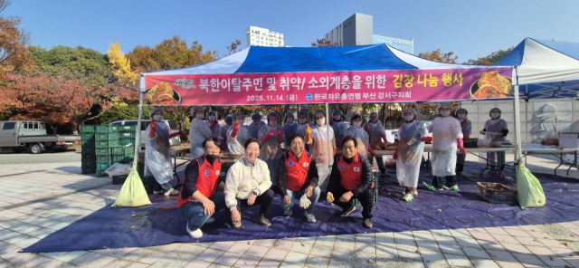 한국자유총연맹 부산강서구지회(회장 최정진)는 14일 강서구청 앞 광장에서 ‘북한이탈주민 및 취약·소외계층을 위한 김장 나눔 행사’를 가졌다.
