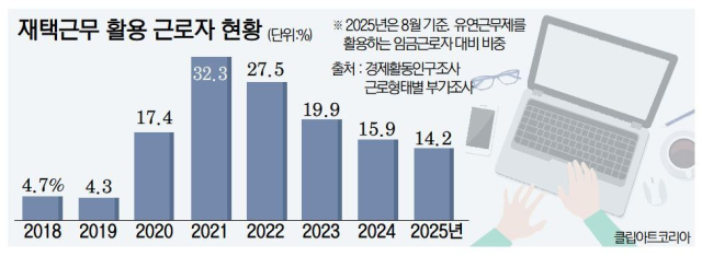 경제활동인구조사 근로 형태별 부가 조사에 따르면 코로나19가 시작되기 전인 2018년 재택근무 비율은 4.8%에 그쳤지만, 코로나19 시기 급등했다 지난 8월 기준 14%대를 유지하고 있다. 코로나19 이후 일부 기업이 재택근무를 단계적으로 폐지하자, 2023년에는 수도권의 한 플랫폼 직원들이 대거 퇴사하는 일도 있었다.