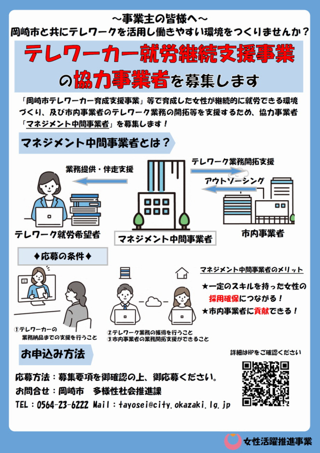 여성의 취업률이 전국 평균보다 낮은 오카자키시에서는 여성의 일·가정 양립을 목표로 여성 원격근무자들의 채용을 지원(포스터)한다. 오카자키시는 중간 사업자와 계약해, 사업자가 발굴한 일자리를 원격근무 형식으로 여성들이 맡게 돕는다. 채용 지원뿐 아니라 근무 중 아이를 맡길 수 있는 돌봄 시설을 지원하고, 해당 업무에 맞는 교육도 함께 진행한다. 도쿄(일본)=박혜랑 기자 rang@