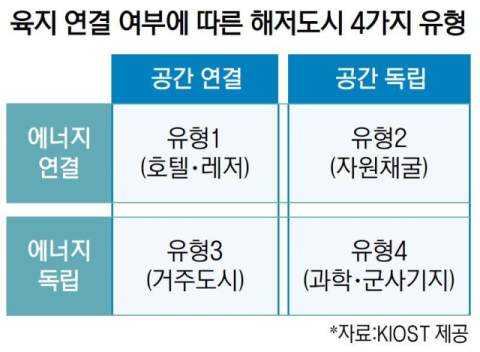 국내 해저도시 연구의 선구자인 한택희 KIOST 책임연구원은 앞서 공간·에너지 측면에서 육지와의 연결성을 놓고 해저도시를 4가지 유형으로 구분한 바 있다.
