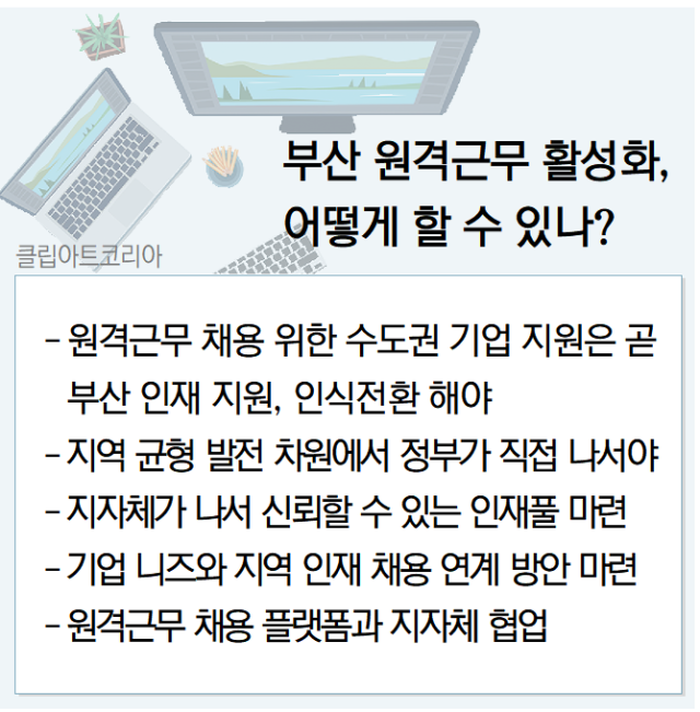 새로운 일하는 방식으로 떠오른 ‘원격근무’가 떠나가는 부산 청년들을 붙잡을 수 있는 현실적 대안으로 떠오르고 있지만, 정작 정부나 지자체의 지원은 여전히 원격근무보다 인재 양성에만 치우쳐 변화의 흐름을 따라가지 못한다는 지적이 나온다. 이에 전문가들은 기업 유치 노력과 함께 IT 관련 일자리가 많은 수도권 기업과 지역 인재를 원격근무로 연결하는 전략을 병행해야 떠나는 부산 청년을 붙잡을 수 있다고 조언했다.
