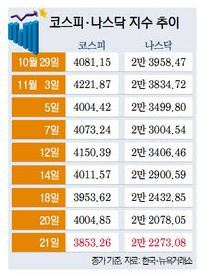 미국 시장 역시 불안하다. 기술주 중심의 미국 나스닥 지수도 10월 29일 2만 3958.45에서 22일 2만 2273.08로 1685.45포인트(7.03%) 하락했다. S&P500 지수도 같은 기간 4.17% 내렸다.