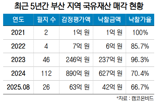 부산 지역 국유재산 낙찰가는 2021년 이후 줄곧 감정가보다 낮았다. 2022년에는 총감정가 7억 원인 4필지가 6억 원에 매각됐고, 2023년에는 총감정가 246억 원인 46필지가 237억 원에 낙찰됐다. 지난해에는 총감정가 890억 원인 112필지가 627억 원에 매각됐다.