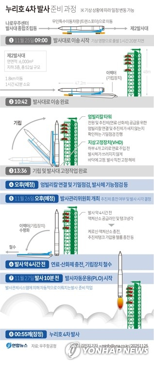다만, 기상 상황에 따라 작업 일정이 변경될 수 있다. 이날 예정된 작업이 모두 완료되지 못할 경우, 26일 오전 추가 작업을 통해 발사 운용을 정상 추진할 예정이라고 항우연은 밝혔다. 발사 시각이 27일 새벽으로 예정된 만큼 내일 오전 시간은 여유가 있는 상황이다.