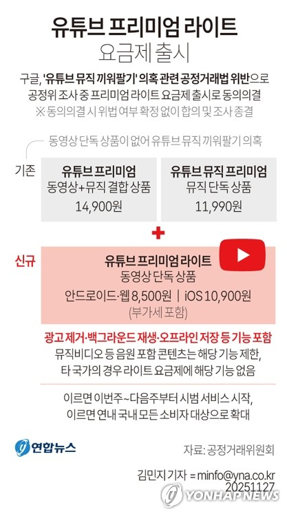 라이트 이용료는 부가가치세를 포함해 안드로이드·웹 기준 8500원, iOS 기준 1만 900원이다. 프리미엄 상품과 비교하면 최대 6400원 싸다. 따라서 유튜브 뮤직을 그리 선호하지 않는 소비자의 경우 동영상은 유튜브 라이트로 이용하고, 음악은 유튜브가 아닌 다른 음원 스트리밍을 구독할 수도 있게 될 것이라고 공정위는 내다봤다.