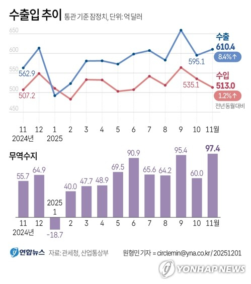 11월 수출 610.4억달러, 8.4%↑…‘미 관세’에도 대미 수출 -0.2%로 선방(종합)